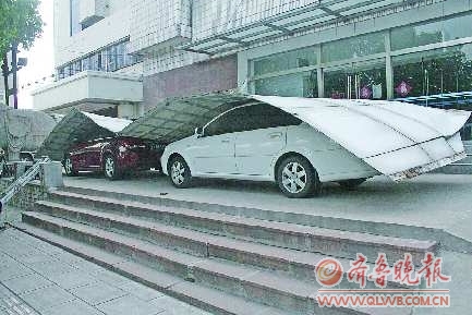 4月29日上午,经七路南侧一家宾馆门头上方,一块长六七米、宽约两米的板材突然坠落,停在其门前的两辆轿车不幸被砸,所幸车内无人,未造成人员伤亡。现场一名工作人员说,坠落的这块板材用于外部防水,可能因安装多年,加之当天风大,才发生了意外。
