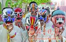 日前,在历城区张马屯小学举办的第一届京剧艺术节上,孩子们戴上自己制作的脸谱,向家长汇报自己的京剧成绩。 本报记者 周青先 摄