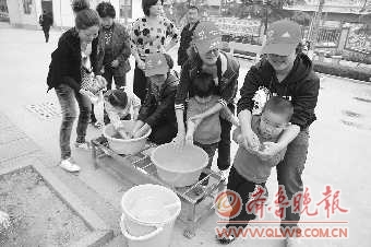 4月26日,华强集团团委组织青年志愿者到社区、老年公寓、兰山幼儿园等地开展了以“汇聚青春力量,共建和谐兰山”为主题的系列活动。志愿者们深入社区清扫树叶、垃圾,接送幼儿园孩子上下学等,通过实际行动感染带动身边更多的市民参与到“两城同创”中来。图为青年志愿者们为孩子们洗手消毒,预防手足口病。