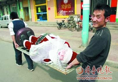 事件:在市区沂州路上,俩青年用铁担架抬着一个