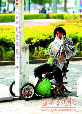 事件:在临沂人民广场,一个“测量身高、体重”经营者,,读报学习。