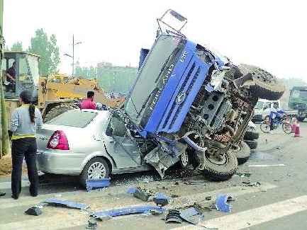 4月30日早,327国道上一辆拉沙的大货车因躲避迎面而来的轿车,和同向行驶的货车发生追尾后侧翻,车头直接砸向旁边的轿车,轿车副驾驶位置被砸瘪。大货车上的黄沙倒在马路中间,导致327国道交通堵塞约两个小时,事故没有造成人员伤亡。