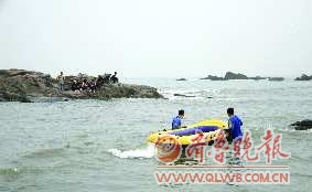 2日下午,在青岛极地海洋世界附近的礁石上,13名外地游客只顾着欣赏美丽的风景,被涨潮的海水困在礁石上。经过30分钟的救援,被困游客乘坐橡皮艇顺利上岸。这是继5月1日4名游客在小麦岛附近海域被困之后,再次发生的涨潮困住游客事件。(详见C03版) 本报通讯员 赵巍巍 摄