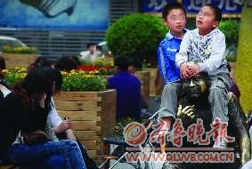 2日,在台东三路步行街,两名孩子骑在雕塑脖子上玩耍,不仅危险而且也非常不文明。 本报记者 张晓鹏 摄影报道