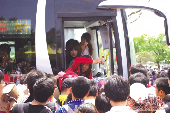 5月1日中午,一名挤上K3路公交车的女游客费力地拉扯着身上的背包。当日,红门公交车终点站游人如织。“五一”期间,泰城各景点挤满了游客。本报见习记者 邵艺谋 摄