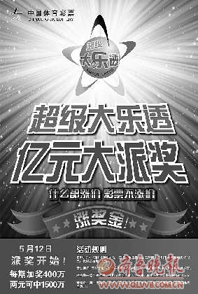 为回馈广大彩友对体育彩票大乐透玩法的支持和厚爱,自2011年5月12日起,超级大乐透将启动亿元大派奖,此次派奖自大乐透第11055期起,每期派奖400万元,连续派送25期,直到一亿元派送完为止。派奖期间,彩友用更少的投入,能够得到更高的回报。届时,千万巨奖的出现将更加频繁,只要投入2元就有机会收获1500万元的巨奖,而3元追加投注最高能拿下2400万的惊人局面将由大乐透来创造!这是目前中国彩市单注奖金能够达到的最高金额。