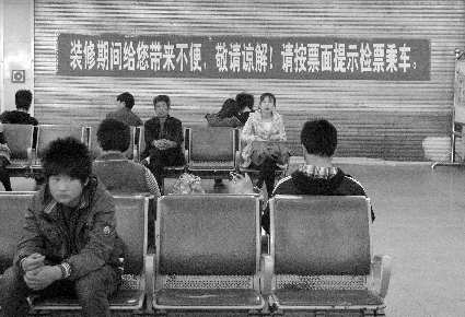 记者从车站北门进站后发现,西候车厅已被两道卷帘门封闭,在醒目的位置红色条幅提示旅客该怎样乘车。烟台汽车总站站长助理王莎告诉记者,此次装修将扩大停车场、发车场面积,扩展售票厅,增加售票窗口。西候车厅要在原有空间内再加一层,将来乘客可通过扶梯在加层区域候车。