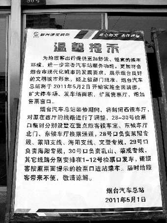 烟台汽车总站工作人员介绍,此次装修改造主要是为了给旅客出行提供更加舒适、惬意的候车环境。期间,对乘车线路和检票口进行临时调整。此次大规模装修结束后,将进一步完善烟台汽车总站的服务功能。