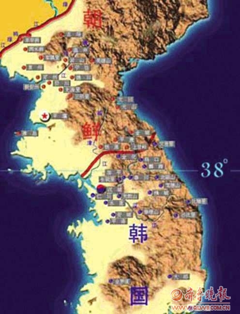 朝鲜半岛上北纬38度附近的一条军事分界线,统称“三八线”,北部为朝鲜,南部为韩国,总长248公里,宽约4公里。