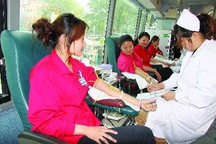 5月3日上午,桃源超市的工作人员在献血车上献血,以此迎接“五四”青年节的到来。短短2个小时,44位超市团员青年无偿献血12000毫升。