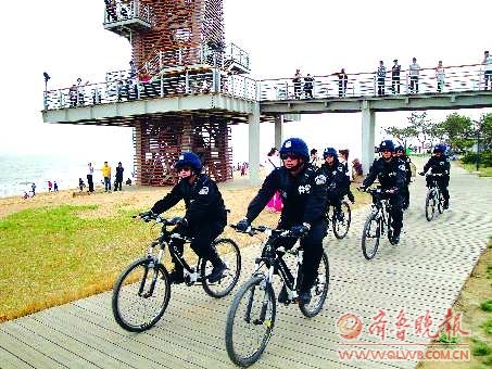 5月3日,日照市公安局针对旅游旺季人口流动性大、治安情况复杂、侵财案件易发等特点,新增20辆特警巡逻自行车到街面巡逻,不但环保无污染,还方便巡逻民警与游客的交流。自行车比汽车体积小,可以深入到汽车不能到达的地方及时发现问题,并随时为游客提供帮助。 通讯员 王猛 摄影报道
