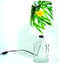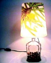 用灯头座、铁丝等把灯头座固定在瓶口,用钉书机或强力胶将灯罩固定成形,把开关接到电线上。