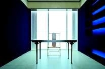 墙面大胆运用深蓝色,直线条勾勒的空间极为简洁,放置造型简单的中式案几和椅子,特立独行。