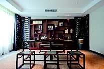 运用回字纹、菱格等传统中式元素,既满足陈列,又体现了设计感。中式家具配驼色地毯,提升了会客区域的舒适感。