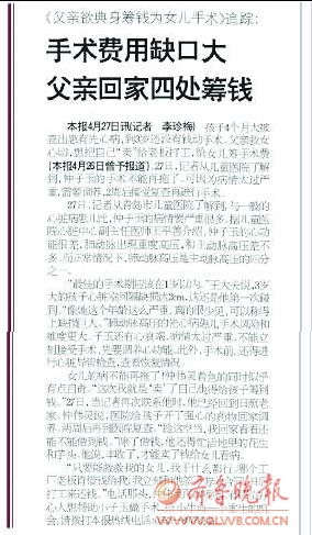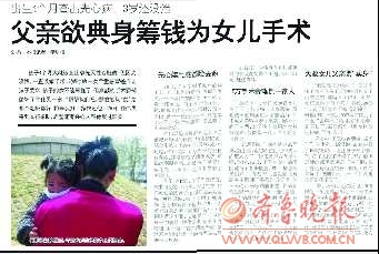 本报5月3日讯(记者 刘丹 李珍梅) 本报连续报道的父亲欲典身为先心病女儿筹手术费一事有了新的进展。3日,记者了解到,仲子玉吃药调养6天后,终于可以到医院来接受手术了。得知这个消息,父亲仲伟灵高兴的同时又显担忧:5万元手术费经各方筹集,还差5000元。