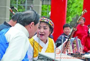 5月3日,在德州和谐园,两位准备上场表演的市民正在认真对着要唱的歌词。这些退休的老人们组织的红歌演唱团有多年的历史,已经成了德州街头的一景。