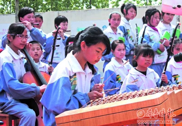 4月29日,惠民县梁家希望小学的小学生们在表演节目。每天下午最后一节课,该校的小学生们就开始了艺术教育,全校400余名学生,就有200多人学乐器,农村孩子们也享受到了城市般的教育。