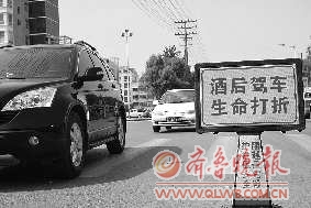 5月1日起,醉驾将面临刑事处罚。此日起,滨州市重要交通路段都设置了劝阻酒驾的警示语,在黄河八路渤海八路交叉路口,记者就见到护栏上贴有“酒后驾车,生命打折”的提醒标志。 本报见习记者 李运恒 摄影报道