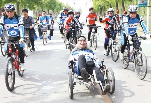 5月3日上午,市第一届全民健身运动会开幕式暨自行车环城环湖骑行活动举行,来自30多家单位4000多人参加骑行活动,其中年龄最大的78岁。 本报记者 李军 摄