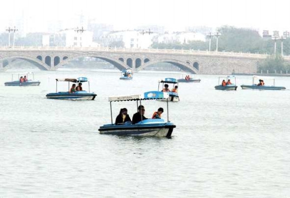 5月3日,东昌湖上游船点点,游人笑声不断。最近天气转暖,游船生意比较红火,一家游船公司负责人介绍,他们有50只游船,游客多的时候,经常要等半小时才能玩上。