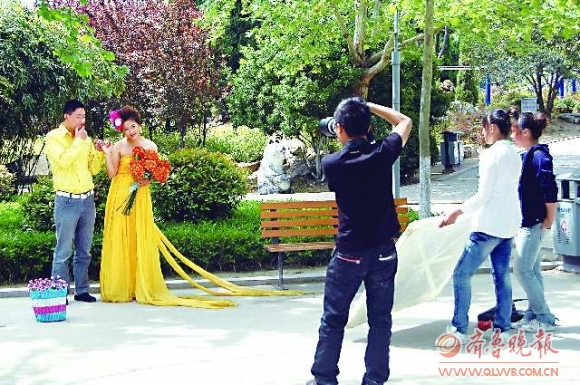 5月3日,记者在天香公园看到,一对新人正在树下取景拍婚纱照,摄影师的相机对准新人不停地按快门,为他们留下甜蜜的瞬间。记者发现,“五一”小长假期间,市区公园里迎来一对对拍摄婚纱照的情侣,趁着春暖花开,风吹柳飘的季节,外景拍婚纱照成为不少新人的首选。
