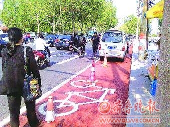 4月27日,在文化西路刚铺好的彩色自行车专用车道上,多辆轿车违法停放,自行车被挤到了机动车道上。 作者 宗学刚