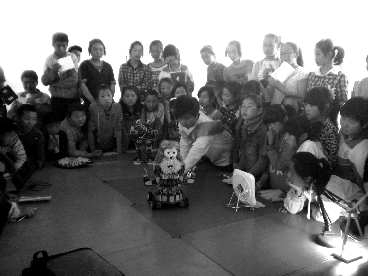 3日下午,在望留中心小学餐厅内,由几张餐桌搭建起的展示平台上,两台机器人不断地摆出各种动作同时发出不同的声音,太阳能电风扇在电灯泡的照射下不停地转动。来自山东科技职业学院的7名大学生被一群小学生团团围住,解惑答疑之外,还要给热心的小“粉丝”们签名。