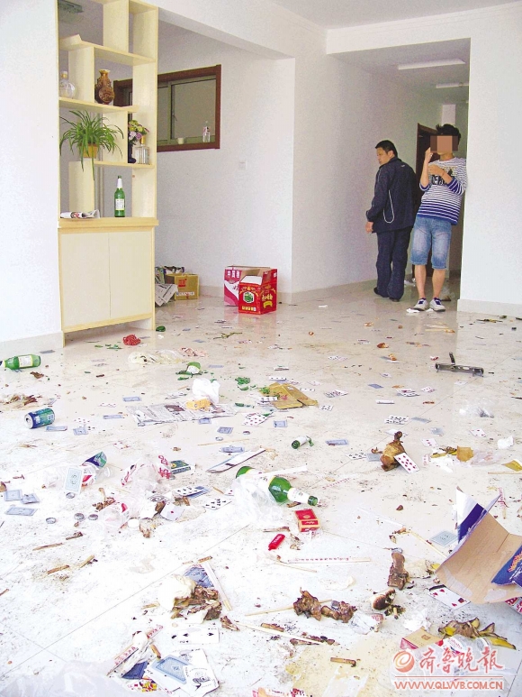 5月4日下午,记者来到了双方共住的家中。打开已经变形的防盗门,记者看到客厅里面一片狼藉,有扑克牌,有吃剩的饭菜,还有碎啤酒瓶,所有杂物全部扔在地板上。