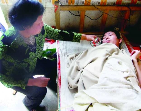 4日上午,程园的母亲在给他喂水喝。2009年1月25日,因一场车祸,程园高位截瘫,如今已卧床两年多。在身体状况越来越差的时候,21岁的程园做出了死后捐献眼角膜和遗体的决定。“如果能让别人失明的眼睛重见光明,自己心里会很高兴。”程园这样说。 本报记者 郇恒吉 左肖 摄