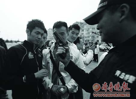 4日,中国国家羽毛球队全体队员来到青岛市公安局特警支队参观。队员们观看了击靶击破、擒敌拳和排爆等演练。图为林丹(左一)等队员对特警的装备很感兴趣。