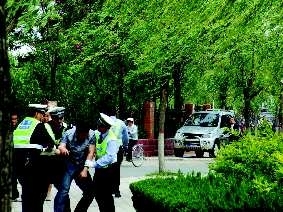 图为:执勤交警把酒司机杨某架到车上进行酒精检测。