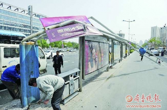 5日上午9时,在经十路“山大路南口”公交站点处,十四五米高的路灯拦腰折断,横架在人行道上,路灯顶端的风帆板已被刮落,躺在路中央,两米长的刮擦痕迹清晰可见。济南市路灯管理处的5名工作人员正在修理。