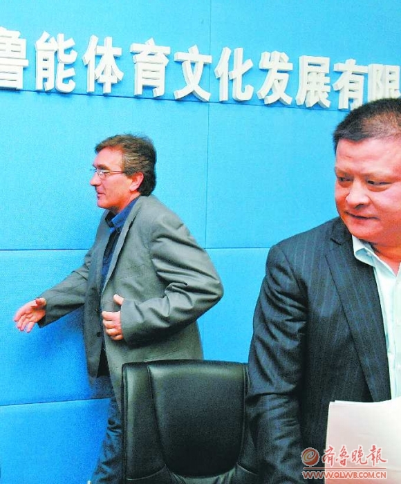 5日晚9时许,鲁能俱乐部在济南召开新闻发布会。鲁能俱乐部副总经理韩公政宣布了伊万下课的消息,助理教练马季奇出任球队执行教练。图为发布会结束后,在鲁能总经理孙国宇(右)注视下,伊万离场而去。 本报记者 郭建政 摄