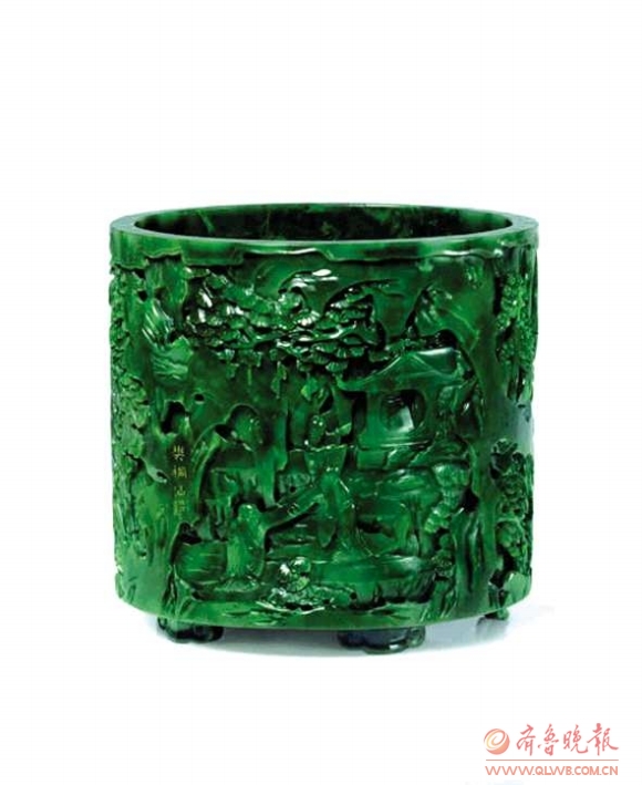 2006年佳士得秋拍清乾隆御制碧玉樊桐仙侣图笔筒,当时估价300-400万港元。