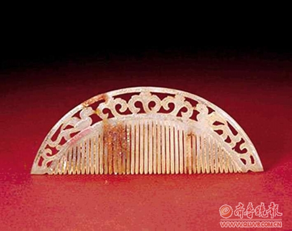 梳玉色白中略青,半圆形,薄片状。外弧饰镂空花鸟纹,中部为3朵花,两侧各有一鸟。梳齿集于下弦,齿密而间距细小,底端平齐。唐代妇女往往在头部插梳以为装饰,此件玉梳器薄、齿短,恐非用以梳理头发,而应是置于头部的饰物。唐至五代,用于头部的玉饰品一般都较薄,且玉质精良,表面少起伏变化,刻画图案多用阴线,线条直而密,这些特点在此玉梳上有明显的体现。