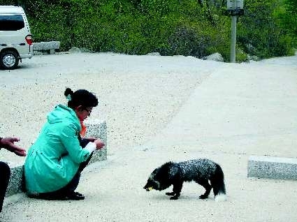 “放生以后很难看到狐狸集中出现,一般都是单只在活动。”5日中午,记者跟随牙山国家森林公园导游矫娑娑上了山,在一个停车场周围,记者发现了一只小狐狸。这只狐狸的颜色银灰相间,大概有30厘米长,并不怕人。看到记者手里拿着苹果,小狐狸随即窜到了记者面前。似乎小狐狸对苹果并不感兴趣,咬了一口之后,便转身离开了。据工作人员介绍,小狐狸比较喜欢肉肠一类的食物,“好多游客过来喂的肉肠、面包,它们都特别喜欢吃。”