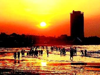 落日余晖霞满天,海浪轻轻拂沙滩。傍晚的烟台市第一海水浴场,人们徜徉在海滩上拾贝漫步,好不惬意。