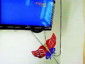 作品描述:我们学校多媒体室里,电视机下面垂着两条黑色的信号线,不太美观。张老师突发奇想,用即时贴剪了一个蝴蝶粘在墙上,猛一看就像蝴蝶的双须,太有创意了。