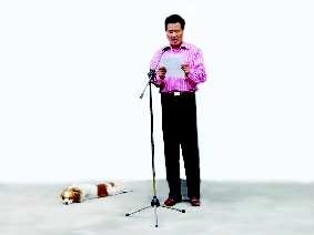作品描述:主持人正在致祝词,一只小狗突然跑上台趴下闭目倾听,神态很可爱。