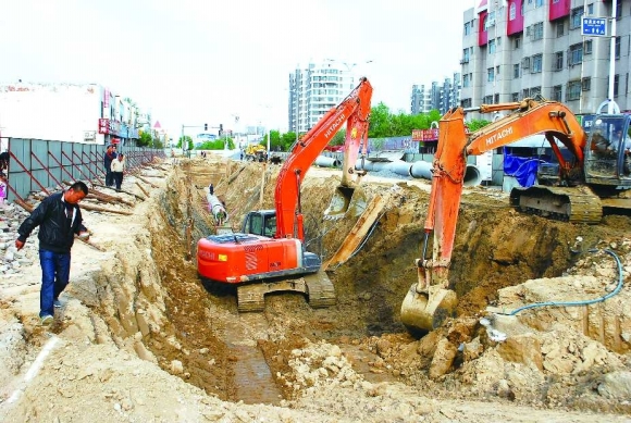 5月5日,运河路的东三路至胜利大街一段正在进行污水管线改造。据负责现场施工的李经理介绍,该管线全长1200米,由于区域内居住人口的增多,现将500毫米的管线换成1000毫米,以满足污水的正常排放,该路段将在6月底实现通车。 本报记者 任小杰 摄影报道
