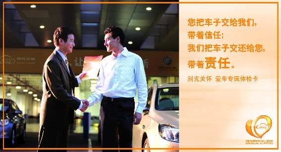 2011年4月2日至9月30日期间,所有符合条件的别克新君威、新君越车主均可在全国别克经销商享受到“别克关怀-360度全方位活动”第二季服务:获赠一张精美的“别克关怀”车辆体检卡,消费者可通过预约进行一次全车免费检测;同时,免费获得为爱车量身定制的六选一售后保养套餐,共有划痕修护、漆面维护、安全卫护、低碳养护、清新呵护、附件陪护6套套餐可供选择,车主可以从中任选一套给爱车做有针对性的贴心养护和“理疗SPA”,既为爱车营造更为清洁、舒适的驾乘环境,又能提升车辆的行驶安全系数,以及延长车辆的使用寿命。为了让消费者更为直观、迅捷、详细地了解活动内容,手机彩信将会精准发送到“双君”车主手机上。此外,双君车主还能收到设计精美的“别克关怀-360度全方位关怀”保养套餐礼券,车主在参与活动的点滴中感受到“别克关怀”的细致和体贴。