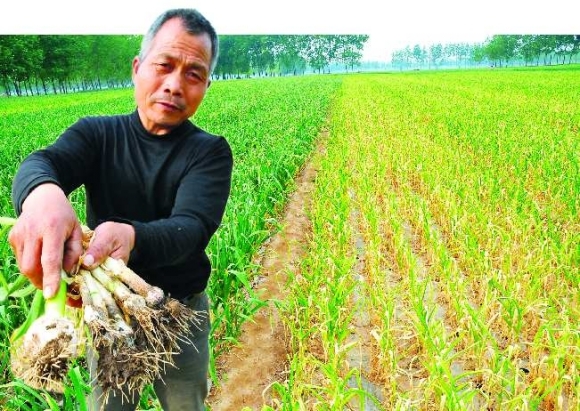 图为:相邻两块地的大蒜生长情况截然不同,没用河水浇的蒜苗长势良好。村民向记者介绍,用河水浇过的蒜苗根部出现发黑腐烂现象。