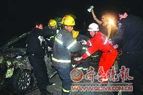 本报济宁5月5日讯(记者 陈鸿儒 通讯员 赵福军) 4日晚,日兰高速济宁段发生一起车辆追尾事故,一辆轿车高速行驶中撞上一辆大货车尾部,轿车受损严重,3人被困车内。济宁消防接警后迅速赶到,经过15分钟的努力,将3名被困车成功救出,抬上120急救车送医治疗。