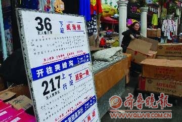 4日下午,在市北婚纱一条街上,一处公交站点被商贩占据,公交站牌也被挡得严严实实,很多乘客只能站在马路上看一处木质的“临时站牌”,十分危险。据介绍,这是一名商贩为了方便乘客坐车仿制的。本报记者 张晓鹏