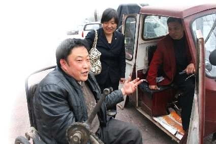 2011年4月21日上午,潍坊银座商场停车场,朋友找人帮忙从三轮车后把轮椅抬下来,王树成用双手支撑着,“爬”到轮椅上。