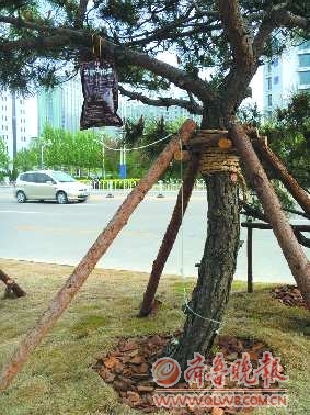 本报5月5日讯(记者 李沙娜 见习记者 张雪丽) 4日,记者在黄河五路看到,绿化带内的黑松上都挂着1-2个输液袋,树木的根部堆放着木片,园林处的工作人员告诉记者:“输液是给黑松补充营养,增加树木成活率,而根部放的木片是松树皮,这能起到保湿的作用。”