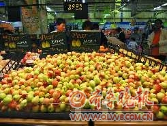 5月3日,滨州大润发超市内摆放着刚刚上市的新鲜油桃。价格不到4元/斤,因而销量不错。