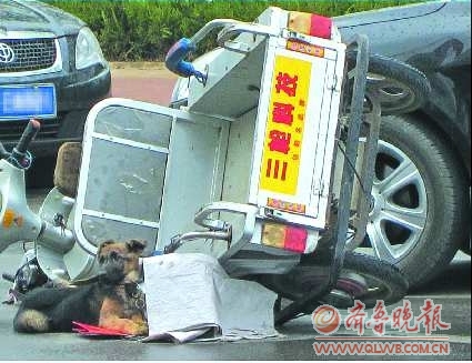 5日下午,渤海九路一电动三轮车与一辆黑色轿车发生磕碰。电动车车主因伤已离开,现场只剩一只狗因被拴锁在电动车上无法脱身。