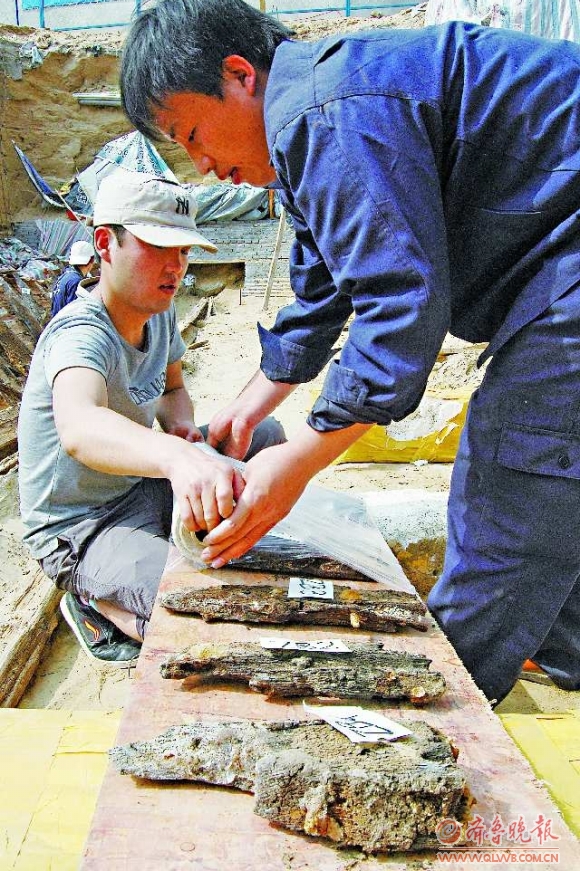 本报菏泽5月5日讯(记者 胡志英 见习记者 张园园) 菏泽古沉船要“启航”啦!5日,在菏泽古沉船发掘现场,工作人员正对右船舱壁板和右船舷板进行编号、贴签,分解、提取后将运送到菏泽市博物馆进行复原。
