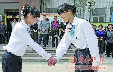7日是济南中小学的校园开放日,在济南第三职业中专校园内,学生们正在进行礼仪展示,他们身后是前来参观的家长们。 本报记者 王媛 摄